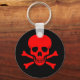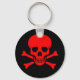 Black keychain with red skull and crossbones.