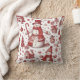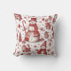 Discover a refined toile holiday throw pillow featuring red and white snowmen with various holiday theme motifs like candy canes, ornaments and holly. This red French-inspired toile design is ideal for an elegant winter accent.