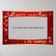 Red Merry Christmas frame to use as a photo booth during the special holiday. The middle grey part is to be cut out, and then the frame will give a nice border when taking photos with family members, or relatives . Before cutting out the middle, the poster can be glued onto something more stable like foam or carboard, if it can be cut through. White snowflakes and starts included, along with golden border. Please personalise family name.