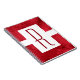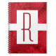 A classic look with a modern touch. A red monogram inside a white rectangle against a red speckled background.