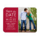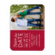 A modern and stylish save the date featuring a bold red typography panel alongside a full custom photo, separated by a decorative scalloped edge detail. Small heart accents frame the date for a sweet, romantic touch. Fully editable names, date, location, and website make this easy to personalise for any wedding style.