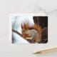 Red squirrel in the winter fur coat, sitting on the tree branch and gnawing at a hazelnut.