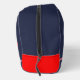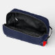 Bright red puffing steam train travel toiletry bag. Personalise with your own name, perfect for overnight railway journeys. Currently reads Daniel and Daniel on boiler plate. Part of the graphic steam train range. Background colour can also be changed to your own colour choice currently in dark blue and bright red. A perfect gift for a train or railway transport fan. Original steam train graphic art and design by Sarah Trett exclusively for www.mylittleeden.com on zazzle.