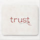 TRUST text in red thread stitching with needle on neutral cream colored textured background.