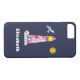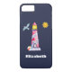 A personalised phone case with a nautical theme. Navy blue background. A red striped lighthouse and a beach ball, with a smiling sun and flying seagull off in the distance.