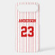 Add a name and number(s) to personalise this custom red pinstripes and white sports jersey inspired phone case. It is an excellent gift for a sports fan or athlete.