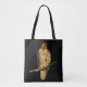 This tote bag features a female Red Tailed Hawk (Buteo jamaicensis). This fierce hunter bird of prey is perched on a branch high up in a tree, patiently waiting for a meal to appear. Her head is brown and the creamy white breast has brown spots.