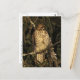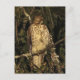 This postcard features a female Red-Tailed Hawk (Buteo jamaicensis).  One of the most widespread and commonly observed birds of prey in North America, this fierce hunter is perched on a branch high up in some evergreen spruce trees, patiently waiting for a meal to appear.  Her head is brown and the creamy white breast has brown spots.  The red tail only is seen from the back.