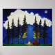 Print of an acrylic painting done by Jeremy Bonsol.  Red tent and camp fire scene lighting up the silhouetted trees in the foreground.  Stars and clouds fill the background to create a peaceful night time camping scene in the woods.
