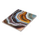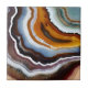 This is a high-quality multicolored white, black, blue, grey, orange, gold, brown and terracotta slice of agate geode close-up.