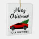 Red Tesla pickup truck with Christmas tree retro Ceramic Ornament . Modern version of old vintage Chevy truck hauling a Christmas tree. Personalized gift for the holidays.