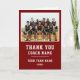 Red Thank you Coach Card Team Name Photo. Personalise with your coach name, team name and year. You can change any text on the card or erase it. A great card for a coach! Add a team photo and get the team to sign the non-designed areas of the card.