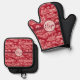 A vintage-looking toile de jouy design of buildings and trees in pink on a bright red background will add bright colour on this oven mitt and pot holder set. Beautiful, elegant, and striking design!