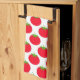 A pattern of red tomatoes on a white background. A salad food themed item. The tomatoes have a green top.