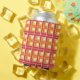 This can cooler has a geometric design of L's in red, orange, and yellow, placed in different directions on a field of white.