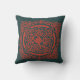 Throw Pillow with red ornament graphic illustration on dark green background.