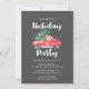 This red truck and tree Holiday party invitation card is perfect for a modern yet vintage style holiday event. The design features a classic old red pickup truck carrying a Christmas tree with a modern hand lettered font on a dark grey background.