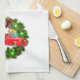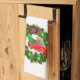 The cutest design on a kitcen towel of an old red truck with a Christmas tree in the back, scooting right through a Christmas wreath