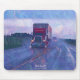 A large red cargo Truck roars down a highway in a rainstorm. The perfect mousepad for anyone who loves trucks and driving. Created by our artist friend Skye, over at zazzle.com/ravenspiritprints.
