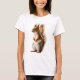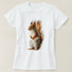 A detailed illustration of a vibrant red squirrel standing upright, showcasing its iconic tufted ears and a magnificent, bushy tail tinged with amber hues. The artwork captures a gentle, curious expression with fine brushstrokes that emphasize the soft texture of its fur against a clean background.