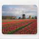 Mousepad with a spring landscape with a field with red tulips and other flowers and a windmill during sunrise in the Keukenhof gardens, Bulb Region, the Netherlands.