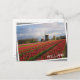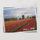 Postcard of a spring landscape with a field with red tulips and other flowers and a windmill during sunrise in the Keukenhof gardens, Bulb Region, the Netherlands with a white edge and the text 'Holland'. The card is a bit rotated to create the illusion of it laying loose.