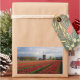 Rectangular photo sticker with a spring landscape with a field with red tulips and other flowers and a windmill during sunrise in the Keukenhof gardens, Bulb Region, the Netherlands.