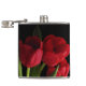 A bouquet of scarlet red tulip flowers and green leaves set on a pure black background grace this gorgeous floral hip flask.