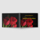 A bouquet of scarlet red tulip flowers and green leaves set on a pure black background grace this gorgeous floral birthday party guest book. Customise all text for your special occasion.