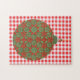 This pretty holiday puzzle features my original art of a red chequered pattern reworked into a slight distressed appearance for the background, with a custom designed vintage tile pattern Christmas ornament in an illustrated and retro style - in mostly red and green tones placed in front and hanging from a gold chain. The size of this unique puzzle is 11” x 14”, and in the ‘challenging’ category, however you may size up or down as desired.