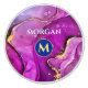 A trendy red-violet and gold liquid ink design with personalised yellow monogram and white name in dark blue and gold circle.