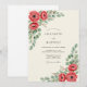 This design features vibrant red ranunculus blooms paired with lush green eucalyptus foliage. The botanical elements are arranged in delicate corners against a warm cream background, creating a romantic and timeless mood. Perfect for a sophisticated nature-themed event, the watercolor textures bring a soft, artistic feel.