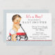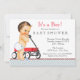 Boy baby shower invitation with adorable little boy and cute red wagon on a baby blue and red background. This adorable red wagon baby shower invitation is easily customised for your event by simply adding your details in the font style and wording of your choice. You can also change the background colour.