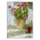 Red watercolor geranium in blossom in front of the stone wall in Cyprus