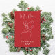 Red background, and a white abstract one line reindeer. Personalise and add a name and year. Text: Merry Christmas.