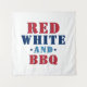 Bring the laughs to your cookout with this playful Red White and BBQ tapestry featuring bold red and blue block lettering with star accents on a white background. A fun and punny Fourth of July barbecue photo backdrop, Independence Day barbeque party decoration, or summer grilling wall hanging.