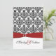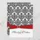 This black and white damask wedding invitation has a red PRINTED ON ribbon and jewel brooch that would be perfect for a red, white, and black themed wedding. The text and paper type are customisable. If you require any other matching items, such as photo cards, keychains, please email niteowlstudio@gmail.com. Existing matching items are shown below. There is also a square invitation in this design but the RSVP cards do not fit inside it. You must use this invitation if you want to mail out a postcard RSVP card, or the larger of the 2 RSVP's in this design.