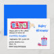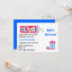 Cute baby shower invitation, with a whimsical baby bottle, at the top, with graphic text reading BABY. A sweet little boy's striped overalls and pair of tiny red tennis shoes decorate the bottom right of the invitation. Text is fully customisable to suit your needs.