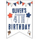 Celebrate your little one's special day in true patriotic style with our delightful Patriotic Bear Ice Cream Party Bunting Flag! This charming flag is the perfect addition to any kids' birthday party with its adorable red, white, and blue illustrations and customisable features. Featuring 4th of July ice cream party themed accent illustrations of a loveable red, white, and blue bear clutching stars and stripes balloons, a festive patriotic bear ice cream truck, and a delightful ice cream graphic, this bunting flag embodies the spirit of fun and celebration. Each element beautifully captures the essence of a joyful ice cream party with a patriotic twist. What makes this bunting flag truly special is the option to personalise it with the name and age of the birthday child. Imagine their delight when they see their own name proudly displayed alongside these cute coordinating illustrations. Whether you choose to hang it indoors or outdoors, it will instantly enhance the festive atmosphere and add a touch of charm to your summer party decorations. Let the festivities begin with our delightful Patriotic Bear Ice Cream Party Bunting Flag. Order now and make your little one's birthday celebration an unforgettable event!