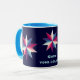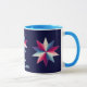 This lively patriotic mug sports three simple pinwheel patterns of red, white and blue in the shape of a star. The text reads: Show your colours! It can be customised or removed.