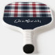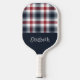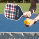 Modern red white and blue tartan pickleball paddle featuring customisable name to complement your style on the court.