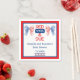 Celebrate your little one this 4th of July with cute stars and stripes bows flanking some retro typography: Red, White & Due Baby Shower design. Add your details and enjoy a great BBQ Baby Shower.