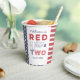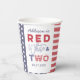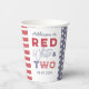 All-American "Red White And TWO" paper cups, incorporating the Stars and Stripes. This fun 2nd birthday party design would work especially well for an outdoors event eg grill or cookout.