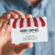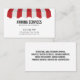 This business card features a red and white and grey illustration of an awning against a plain white background, with key details in serif font in black.