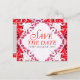 Elegant decorative design in vibrant red and white Batik inspired design, wedding or engagement announcement save the date postcards. Affordable wedding cards without compromising on style and design.