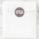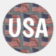 This round sticker features the Red, White and Blue US Flag on a fuzzy background with a tiled pattern. The word "USA" appears in big white letters on top. It's good for everyday use, special occasions, as well as Independence Day, 4th of July, patriotic celebrations. You can customise it if you like. Brighten up packages and more with this eye-catching sticker!