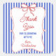 This All-American Girl birthday design features a retro-style vertical blue and white striped background accented by a hand-drawn decorative red bow frame. The clean, patriotic design is ideal for summer birthday parties, July 4th celebrations, or Americana-themed first birthdays.