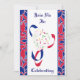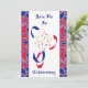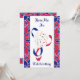 This wedding invitation is decorated with a bridal bouquet and Red, White, & Blue, damask bars on a white background.