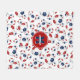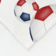 This cool team colours soccer fleece blanket for boys or girls features a pattern of varied size soccer balls turned every which way - the black panels on the soccer balls have been recolored red and blue - customise with soccer player's name and monogram or jersey number - by katz_d_zynes