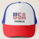Patriotic, cool, comfortable red white and blue classic trucker hat with a USA flag stencil and name. Easily change the name to make it yours using the Template provided. To edit and change font style-color-size and more-- use the Design Tool. Choose from 12 solid and combination colors and other style hats, including the popular bucket hat. 100% nylon mesh back keeps you cool. Adjustable from 17" to 24". See "About" this product for more information and care.